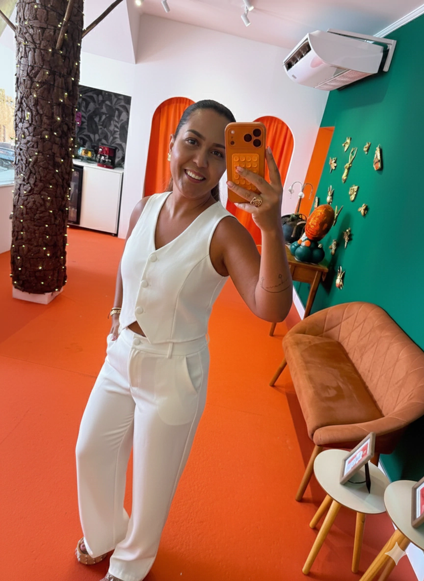 Moderno, elegante e cheio de personalidade, o Conjunto Colete e Calça é a escolha perfeita para quem busca um look sofisticado e atual. Composto por colete com decote em V e fechamento frontal por botões, a peça valoriza o colo e traz um toque fashion ao visual. A calça de cintura média/alta possui modelagem reta, garantindo conforto, elegância e um caimento impecável.